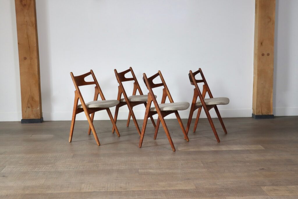 Nice set of 4 iconic model CH29 dining chairs designed by Hans J. Wegner and manufactured by Carl Hansen & Søn, Denmark 1952. This design classic is also called “Sawbuck chair” because the model resembles a sawhorse. The sawhorse was traditionally used in the Scandinavian countries by carpenters and lumberjacks. As all Wegner designs, the CH29 is expertly constructed and very comfortable. This particular set is made of solid oak and features the original upholstery. A nice dining chair set to provide character and the nice Scandinavian design.