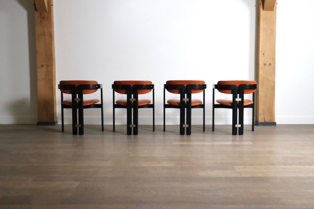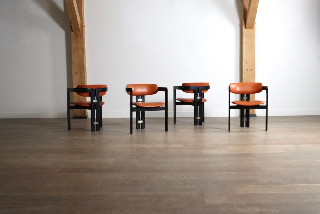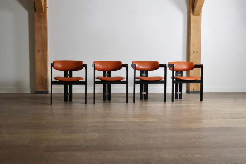 Amazing set of four Pamplona dining chairs in black lacquered Frame with original cognac leather, which were manufactured in Italy during the 1960s. The Pamplona chair was designed by Augusto Savini for a hotel interior in Milano. Savini’s design was inspired by the traditional Italian Pozzetto chair from the 15th century. The usage of high quality materials is what makes this design special and still a very popular design. A beautiful combination of the black lacquered wooden frame, connected by metal details and original cognac leather upholstery will elevate any dining room!