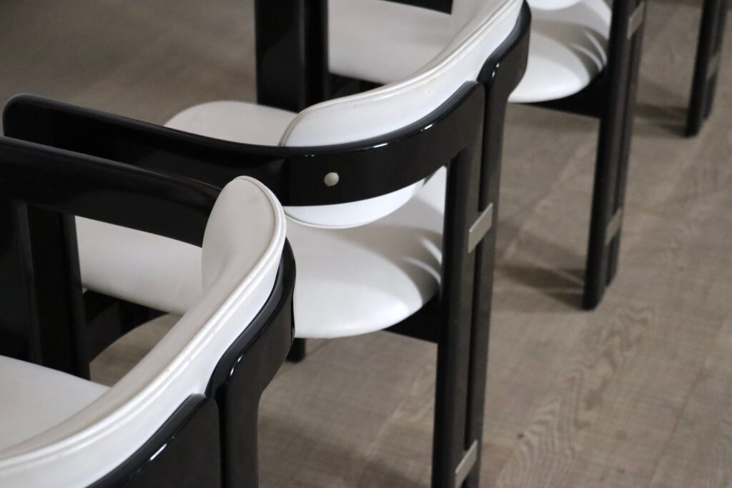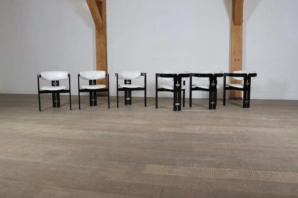 Nice set of six Pamplona dining chairs in black lacquered Frame with white leather, which was manufactured in Italy during the 1960s. The Pamplona chair was designed by Augusto Savini for a hotel interior in Milano. Savini’s design was inspired by the traditional Italian Pozzetto chair from the 15th century. The usage of high quality materials is what makes this design special and still a very popular design. A beautiful combination of the black lacquered wooden frame, connected by metal details and original white leather upholstery.