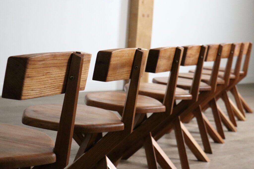 Stunning and rare set of eight Pierre Chapo S34 dining chairs, handcrafted in solid elm wood, France, 1970s. These authentic pieces were produced by Atelier Chapo and perfectly express Chapo’s dedication to honest materials and architectural design.