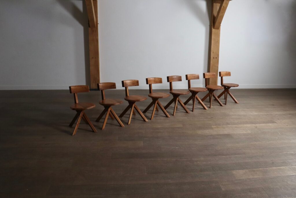 Originally designed to pair with the “Sfax” dining table, this set of eight S34 chairs stands as a timeless example of French modern design. A rare opportunity to find a complete and well-preserved set by one of France’s most respected designers.