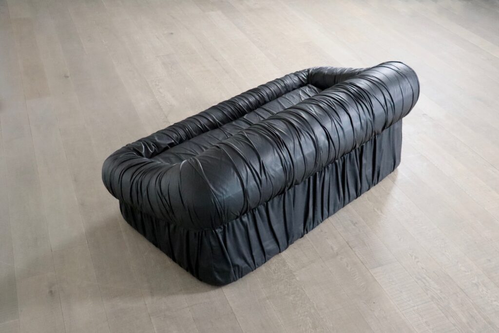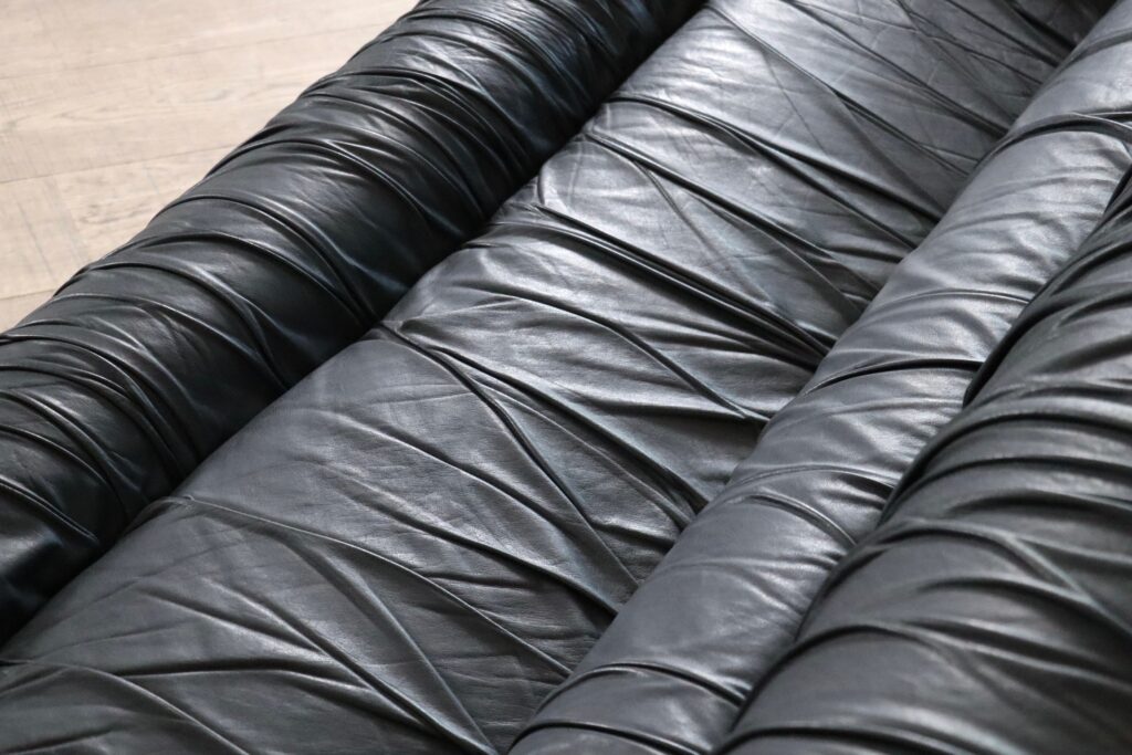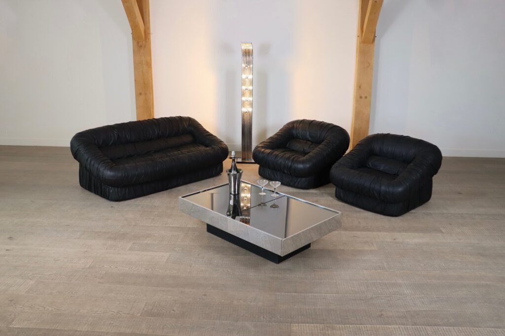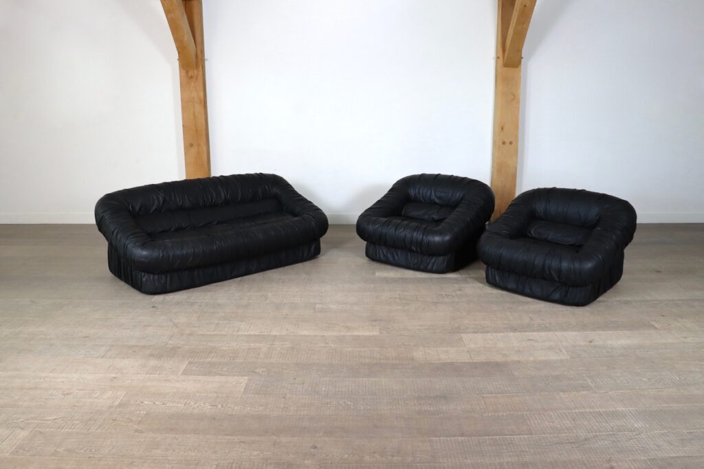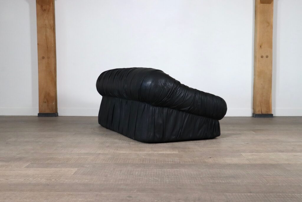 A highly comfortable design, with the iconic allure of the seventies. The original black leather upholstery, with a wrinkle stitch gives shape and an interesting texture to this chunky sofa. The sofa has the Dall’Oca label under the cushions.